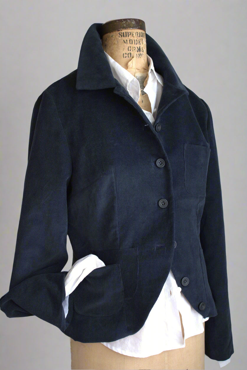 Beautifully fitted classic jacket with contemporary details in navy cotton corduroy. It has one chest pocket, and two overlapping pockets on the front opposite side . This jacket is very fitted when buttoned up, creating a clinched waist silhouette. It also looks great just left open. If you want to do it up, do so using any of the top four buttons to your liking. The rest of the buttons are design details to following the curve of the jacket front. Perfect to wear for work, and at the weekend with your favourite jeans, for a very smart/casual look. Made in quality cotton and fully lined. Length is approximately 56cm.