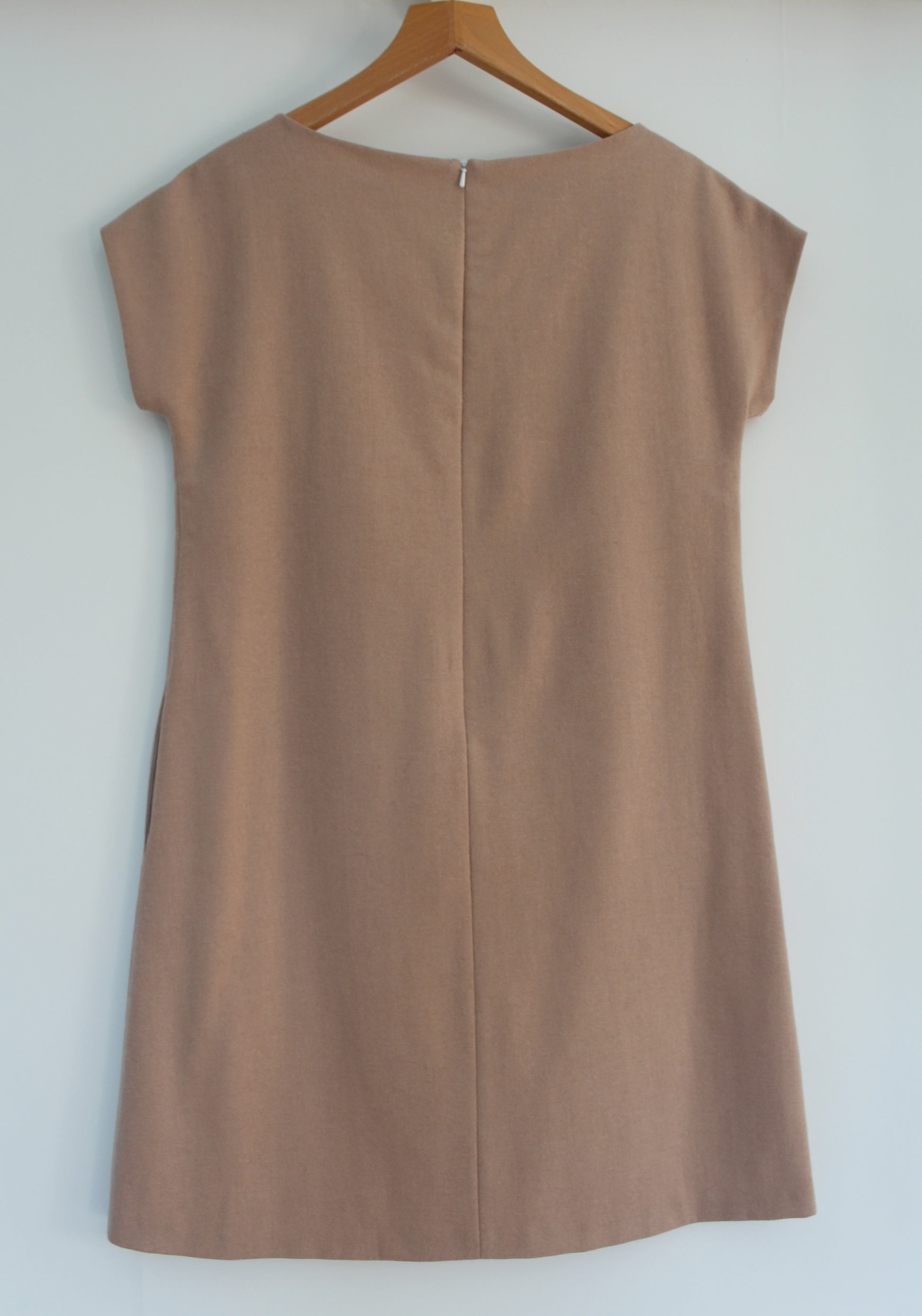 Eliza is a very simple but stylish A-line dress. Made in soft, pure wool and fully lined in cotton, it is perfect for both work or play. Great trans-seasonal dress to see you through all year round. Model wears it with shirt to demonstrate how versatile it is! Flattering boat neckline with cap sleeves and very useful side seam pockets. Falls onto knee with back zip.